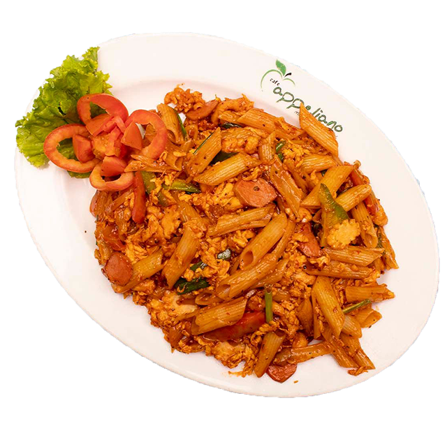 Non oven baked pasta prepared with bbq chicken, egg, mushroom, sausage, capsicum, onion, chili & secret sauce